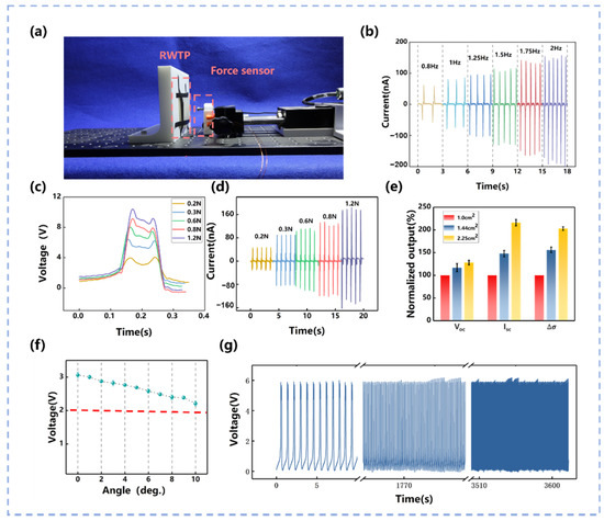 (a) Experimental platform with the force sensor and linear motor; (b) short-circuit current of RWTP under different frequencies; (c) output voltage of RWTP under different forces; (d) output current of RWTP under different forces; (e) influence of different size of RWTP unit on the output characteristic; (f) influence of different force angle of RWTP on the output voltage; (g) stability of RWTP.