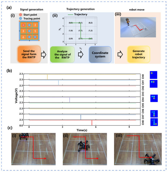 As shown in Figure 4a(i), the 3 × 3 RWTP unit can communicate with the host computer through nine channels of the circuit and the MCU in the above experiments. Therefore, the trajectory generation is achieved through utilizing the nine units of RWTP completely. As shown in Figure 4a(ii), the trajectory generation of the bionic hexapod robot is achieved by slidings finger on the RWTP. The bionic hexapod robot can be connected with RWTP by constructing the 2D coordinates system through Equation (6).
