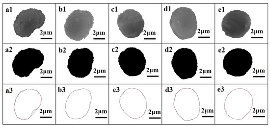 Based on the binary image, Matlab was sequentially used to calculate the CF cross-section perimeter (C) and cross-section area (S). Firstly, the Canny Operator built into Matlab was used to extract the coordinate of each point on the boundary of the CF cross-section to generate a contour image, as shown in Figure 1d. The scale of the original SEM image and its number of pixels were used to calculate the actual size represented by each pixel. In this work, one pixel actually corresponded to 5 nm. Then, the numbers of pixels included in the perimeter and in the area of the CF cross-section were calculated by a binary image labeling algorithm. In the next step, the units of the perimeter and area were separately converted into μm and μm2. In order to better describe the shape of the CF cross-section, the roundness value α was used to describe the degree of how the CF cross-section was close to a perfect circle. The α value was calculated using Equation (2):