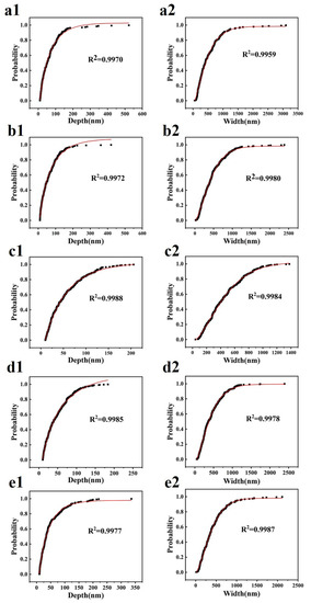 Weibull distribution fitting curve image of carbon fiber groove depth: (a1) CF-1, (b1) CF-2, (c1) CF-3, (d1) CF-4, (e1) CF-5; Weibull distribution fitting curve image of carbon fiber groove depth: (a2) CF-1, (b2) CF-2, (c2) CF-3, (d2) CF-4, (e2) CF-5.