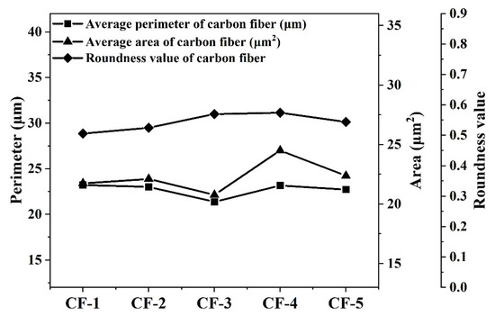 What needs be noted was that the perimeters of five types of CFs were between 21.38 μm (CF-3) and 23.23 μm (CF-1), which were quite different from their nominal perimeter of 16.3 μm (πd). This was mainly due to the fact that the calculation of the nominal perimeter of the CF cross-section refers to the calculation method of a standard circle, which ignored the grooves, bumps and pits on the CF surface. However, the areas of five types of CFs were between 20.77 μm2 and 24.51 μm2 and were nearly equal to their nominal area of 21.2 μm2 (0.25πd2). It is indicated that grooves, bumps and pits made a bigger difference to the CF cross-section perimeter than the area.