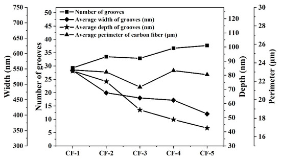 The average number of grooves on each single CF filament was between about 30 and 40, the average width was between about 400 nm and 550 nm and the average depth was between 40 nm and 85 nm. The D/W of five types of CFs was between 0.11 and 0.16. Further analysis for these groove data indicated a trend: from CF-1 to CF-5, the number of their grooves was increasing, while both the width and depth of their grooves were decreasing, as shown in Figure 7. The grooves on CF-1's surface were the widest and deepest, while the grooves on CF-5’s surface were the narrowest and shallowest. From Figure 7, there was no obvious correlation between the average perimeter and the groove parameters.