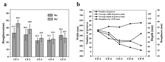 (a) Ra and Ra′ of CFs; (b) the relationship between groove parameters and surface roughness of CFs.