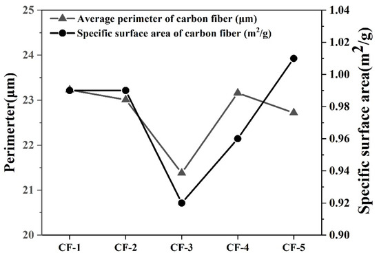 Figure 9 shows the specific surface area and average perimeter of five types of CFs. The specific surface area of different CFs varied from about 0.90 m2/g to 1.00 m2/g. Figure 9 also shows the relationship between the specific surface area and average perimeter of CFs. The average perimeter of CFs was basically consistent with their specific surface area. Because the specific surface area was the total of all microstructures on the CF surface, this result indirectly proved that the calculation of perimeter by Matlab was accurate and reasonable.
