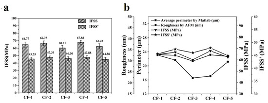 The composite interfacial property is affected by both the physical structure and chemical property of CFs. In this study, the chemical properties of five types of CFs were controlled to be the same, which could be proved by the nearly same chemical element ratio of O and C (O/C), as shown in Table 3. Figure 10b shows the relationship of average perimeter by Matlab, roughness by AFM, IFSS and IFSS’. It could be seen that IFSS, IFSS’ and the average perimeter of CFs all showed the same trend. However, this trend was different from the roughness of CFs.
