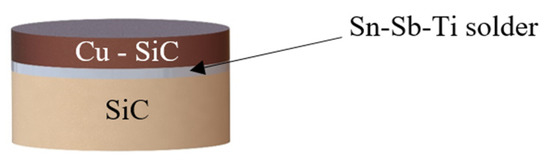 The direct soldering of SiC/CuSiC combination by use of the Sn–Sb–Ti solder similarly requires the selection of the correct technology since it is necessary to activate the Ti element in the solder. Activation at high temperatures is impossible since the metal component of the composite would be molten. Application of ultrasonic soldering for the formation of bonds between CuSiC and SiC seems to be one of the most suitable methods applicable for fluxless soldering of such materials. This process is highly productive. The time necessary for bond formation is just on the order of several minutes. The soldering temperature is 20–30 °C above the melting point of the solder, and the activation of the active element is ensured by the application of ultrasound. The suitability of this method has been approved by many professional publications from the field of brazing and soldering [29,30,31,32] and the field of transient liquid phase (TLP) bonding [33,34,35,36,37].