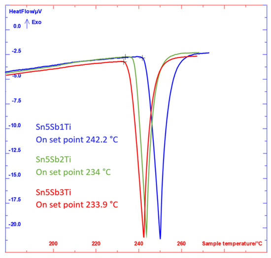 - For determining the melting point, DTA analysis was applied. From analysis of the DTA results, only one reaction was identified, namely the peritectic one at an approximate temperature of 243 °C. Sn–Sb alloys containing 1, 2, and 3 wt.% of Ti were assessed. It was found that a higher Ti content shifts the peritectic reaction toward lower temperatures. The addition of Ti content lowered the melting point of the Sn5Sb3Ti alloy, which resulted in a faster transition from solid to liquid.