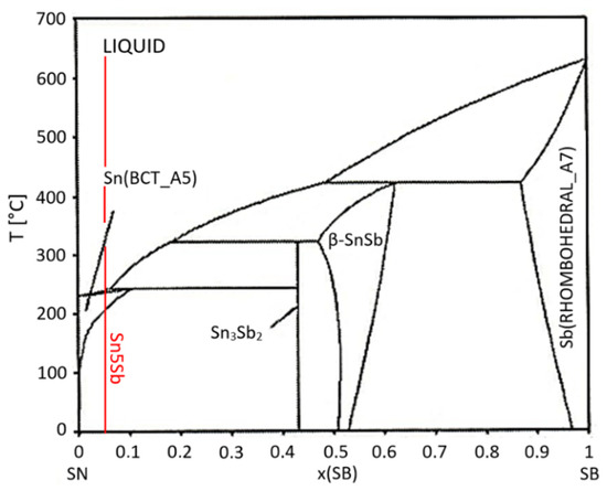 Binary system of tin–antimony [38]. The red line indicates the chemical composition of the Sn5Sb base solder.