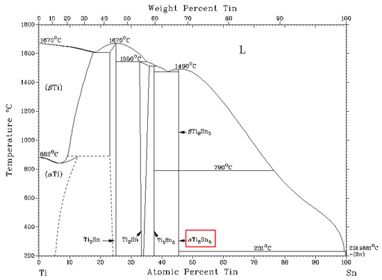 In the Sn–Ti system, a monotectic type of diagram is seen, where the eutectic reaction takes place at the temperature around 231 °C and the Ti6Sn5 phase is formed. In the case of the Sb–Ti system, the formation of Ti11−xSb8−y (resp. Ti6Sb5) phases is probable (Figure 12). These phases were also confirmed by a ternary diagram in the study [29].