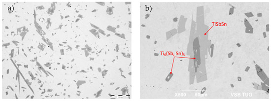 The planar distribution of titanium and antimony phases Ti6(Sb,Sn)5 and TiSbSn in the tin matrix with a low Sb content is documented in Figure 14.