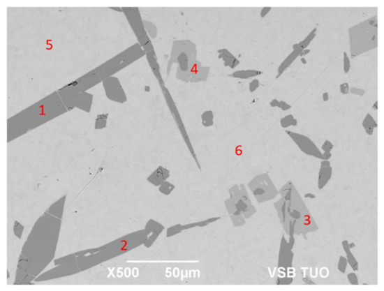 For determination of the chemical composition of individual components of the soldering alloy, EDX analysis was performed (Table 5). The points of measurement are shown in Figure 11, designated with numbers 1 to 6.