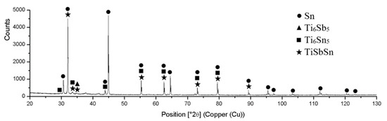 The XRD analysis of the Sn5Sb3Ti solder proved the presence of Sn and Sb and also the presence of intermetallic phases of titanium and antimony, namely Ti6Sb5, Ti6Sn5, and TiSbSn, which were confirmed by the ternary diagram from the study [29]. The record from diffraction analysis is documented in Figure 13.
