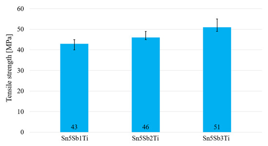 - The Sn5Sb-based soldering alloy attained the average tensile strength of 43 to 51 MPa depending on the titanium content. It was found that Ti addition to a solder partially increases the tensile strength of soldering alloys of the type Sn5Sb. This results from solder matrix strengthening due to intermetallic phases of titanium.