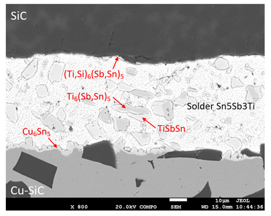The soldered joint of SiC/Sn5Sb3Ti/Cu–SiC was fabricated at the temperature of 260 °C. Owing to ultrasound activation, an acceptable joint was achieved in the soldering process, which did not contain any cracks, nor inhomogeneities. The microstructure of the soldered joint is shown in Figure 16.