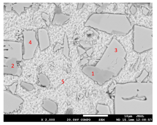 The microstructure (Figure 11) has revealed different morphologically and chemically diverse constituents: