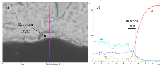 Line EDX analysis of the SiC/Sn5Sb3Ti joint; (a) transition zone with a marked line; (b) concentration profiles of Sb, Sn, Ti, and Si elements.