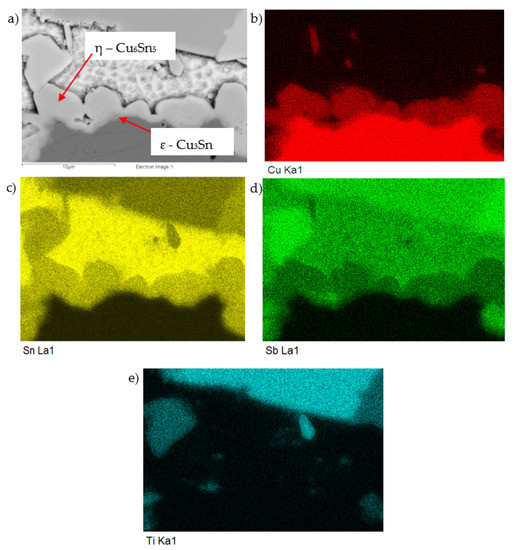 In the points of measurement Spectra 1 and 2, the η-Cu6Sn5 phase was clearly identified. The distribution map of elements in the boundary of the Cu–SiC/Sn5Sb3Ti joint is documented in Figure 22a, clearly showing the η-Cu6Sn5 phase, where the ε-Cu3Sn phase is also partially visible.