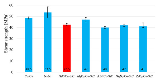 The research in this study was primarily oriented to soldering SiC ceramics with a composite Cu–SiC substrate. Due to possibilities of application of the active solder of the type Sn5Sb3Ti and its further introduction into practice, the testing of shear strength was extended to other metallic (Cu and Ni) and ceramic (Al2O3, AlN, and Si3N4) materials. Ceramic materials were always tested in combination with the composite substrate of Cu–SiC. Metallic materials were mutually soldered, namely Cu/Cu and Ni/Ni. The measurement was performed on three specimens of each material. The results of the average shear strength of the joints are documented in Figure 24. The highest shear strength, achieved with the ceramic/Cu–SiC composite joint, was observed in the case of the Al2O3/Cu–SiC joint (47 MPa). In the case of other combinations with ceramic materials such as SiC/CuSiC, Si3N4/Cu–SiC, and ZrO2/Cu–SiC, a comparable average shear strength in the range from 40 to 42.5 MPa was measured. In the case of metallic materials, the average shear strength of two Ni materials was 53.5 MPa. However, in this case, the widest scatter of measurement, ranging from 48 to 59 MPa, was also observed. The average shear strength of Cu/Cu joint is 48.5 MPa. Although in the case of the SiC/Cu–SiC combination of materials, a lower shear strength of the joint was measured (42.5 MPa), the limit criterion for soldering power semiconductors is 40 MPa. The Sn5Sb3Ti solder thus meets this condition for all materials tested.