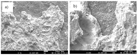 The fractured surface of the soldered joint of SiC/Sn5Sb3Ti/CuSiC; (a) magnification 75×; (b) magnification 250×.