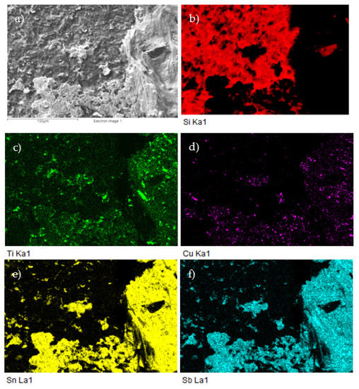 For more precise identification of the mechanism of bond formation, the fractured surfaces of joints were analyzed. Figure 25a,b shows the fractured surface on the boundary of the SiC/Sn5Sb3Ti/Cu–SiC joint. It is evident that the fractured surface from the side of SiC ceramics remained partially covered with the solder. Solder coverage was approximately 80%. Ductile fracture was observed in the solder. Planar analysis of the distribution of Si, Ti, Cu, Sn, and Sb elements on the fractured surface was performed, as documented in Figure 26b–f. The planar distribution of Si element shown in Figure 26b represents the SiC ceramics, and local spots (where the solder was pulled out) may be observed. From the distribution of Ti on the fractured surface, shown in Figure 26c, it may be concluded that Ti is bound to SiC ceramics and thus it contributes considerably to bond formation.