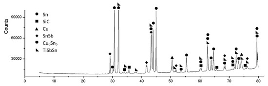 XRD analysis was performed in the boundary of the SiC/Sn5Sb3Ti joint (Figure 27). The analysis proved the presence of a titanium phase of the type TiSbSn and a copper phase of the type Cu6Sn5 on the fractured surface. Moreover, the SnSb phase was also observed, which was not identified by EDX analysis, and its existence is also confirmed by the binary diagram of Sn–Sb shown in Figure 8.