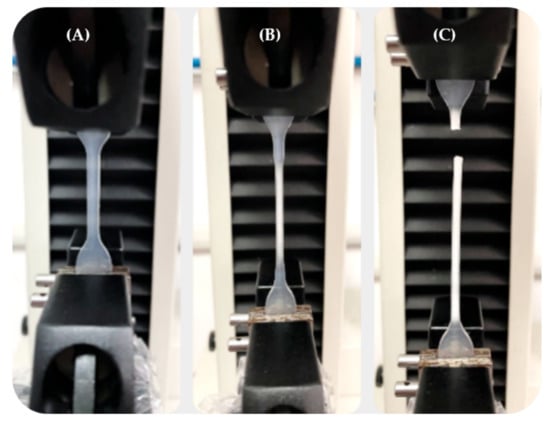 Tensile test on a P(L/DL)LA/PLCL specimen obtained by IM: (A) Specimen in the elastic deformation stage; (B) Specimen in the plastic deformation stage; (C) Specimen at failure.