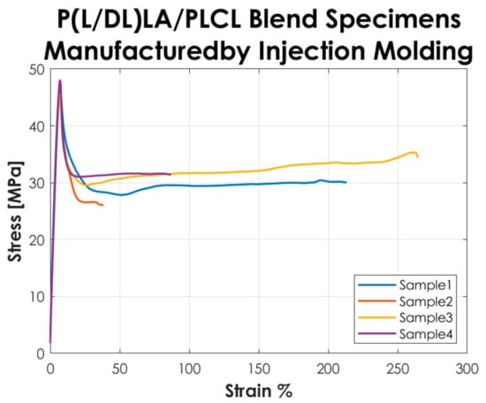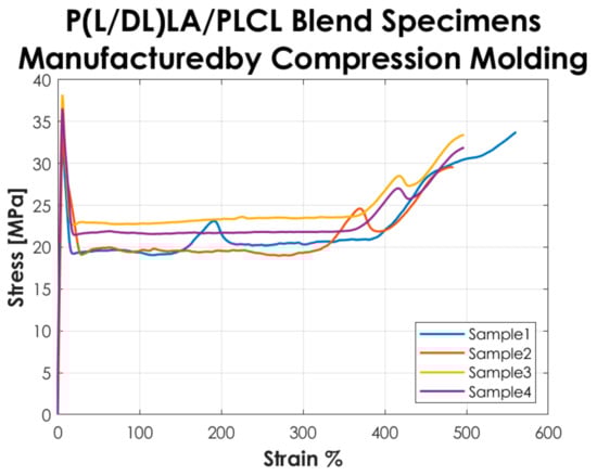 This research focused on establishing the effects of two manufacturing methods, Compression Molding (CM) and Injection Molding (IM), on the mechanical properties of a biodegradable polyesters blend. These two methods represent the most used manufacturing processes in the polymer industry. Specifically, it has been investigated in a 50/50 (w/w) ratio for the manufacturing of implantable devices for tendon repair. Consequently, two tailored synthetic copolymers, Poly(L-lactide-co-D,L-lactide) (P(L/DL)LA) and Poly(L-lactide-co-ε-caprolactone) (PLCL), were strategically selected to match the elastic modulus of the human Achilles tendon (300–1400 MPa) [15]. P(L/DL)LA has been chosen to achieve favorable mechanical properties for medical implantable devices manufacturing, with a modulus of elasticity ranging between 1900 and 2400 MPa and maximum yield stress of about 35 MPa. The amorphous structure of P(L/DL)LA, arising from the random distribution of the lactide monomers, was also expected to contribute positively to the elongation properties [16]. It has been considered adding to the blend a more ductile material with a lower modulus of elasticity such as PLCL, which could be tailored to the target elastic modulus of the medical device material. In particular, the values of the elastic modulus are as much lower as the PCL content is higher. Studies performed on the mechanical properties of this material report a modulus of elasticity of about 239–352 MPa and yield stress of 12–16 MPa were observed [17,18,19]. The P(L/DL)LA/PLCL blend was obtained by using a twin-screw extruder, due to its high efficiency, its short manufacturing time, and high productivity [20]. Subsequently, CM and IM were employed.
