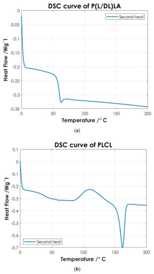 Figure 4 shows the thermoanalytical results of the base materials in the form of pellets. From Figure 4a it is possible to identify P(L/DL)LA characteristic transitions. P(L/DL)LA exhibits a typical glass transition temperature (Tg) of approximately 60 °C, while melting and crystallization temperatures were not detectable, the value of Tg found matches with the datasheet reported by the manufacturer and similar studies reported in the literature [21]. Thus, the typical behavior of the P(L/DL)LA copolymer, which is mainly amorphous, was confirmed. On the other hand, from the DSC curve of the PLCL (Figure 4b) it is possible to identify a glass transition temperature (Tg) of about 60 °C, a crystallization temperature (Tc) of about 110 °C, and a melting peak (Tm) at 160 °C. The temperatures identified are very close to those reported for the PLLA material, since P(L/DL)LA is a 70:30 copolymer, 70% PLLA, and 30% PCL. These values resulting from the DSC are consistent with those reported by the manufacturer and in literature [5,18,22].