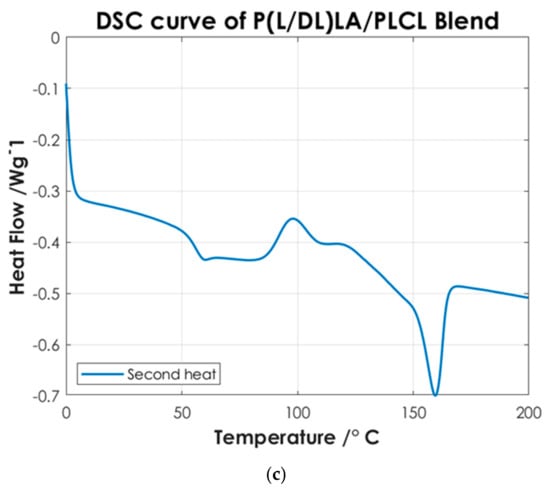 DSC curves of: (a) P(L/DL)LA; (b) PLCL; and (c) P(L/DL)LA/PLCL blend.
