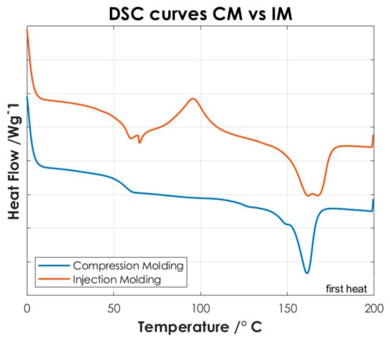 Afterwards, the thermal results of the P(L/DL)LA/PLCL blend were analyzed in the form of pellets before the IM and CM. Indeed, second heating was considered to identify the intrinsic properties of the materials after polymer blending. As of Figure 4c, it is possible to identify a glass transition temperature (Tg) of approximately 60 °C, a crystallization temperature (Tc) of about 90 °C, and a melting temperature (Mp) of 160 °C. The presence of a single glass transition (Tg), crystallization (Tc), and melting (Mp) temperatures evidence the presence of a single phase, which confirms that the melt blending was performed efficiently. As mentioned, the DSC analyses of the manufactured materials for CM and IM were conducted to evaluate the effect of manufacturing methods on the thermal properties of the materials as well as to identify possible differences between the two techniques. Figure 5 shows the DSC curves relating to the first heating as this faithfully reproduces the thermal characteristics of the obtained specimens. In both DSC curves, a glass transition temperature (Tg) of approximately 60 °C and a melting point (Mp) at 160 °C are identified, while the crystallization peak (Tc) at about 90 °C can only be identified in the specimen manufactured by IM. From the summary results reported in Table 2, it is possible to state that there is a difference in the presence of crystallinity (Tc), and orientation in the chains of polymers obtained by the two manufacturing methods. Indeed, the IM method enables the orientation of the polymer chains in a preferential direction, favoring the crystallization peak of the material and leading to an improvement of the mechanical properties; in particular, modulus of elasticity, and stress/strain at yield. Likewise, analyzing the specimens manufactured by IM exhibits a smaller strain. It should be highlighted that the strain effects after yielding are ascribed to the presence of an amorphous PLCL fraction in the blended polymer material [23]. During the tensile test, the polymer chains in the amorphous zone are stretched, thus causing an increment at yielding as shown in Figure 3. In contrast, during specimens manufacturing by CM, it is foreseen that the polymer pellets are arranged randomly on the heating plates without considering a preferential direction. As a result, the crystallinity of the blend is reduced. Indeed, the absence of a Tc in the DSC curve (Figure 5) and the lower values of the mechanical properties (Table 2) show that the specimens manufactured by CM present a lesser crystallinity and they cannot preserve the thermal properties of the material. Other studies confirm the results obtained from the tensile tests performed in this research work, as they state that injection-molded specimens enable reaching higher values of yield stress and tensile modulus than compression-molded specimens [24,25]. These differences highlight the strong impact of the production processes on the mechanical properties of the final product, despite quite similar procedural steps followed in both processes, namely: polymer melting, preparation, pressing, and mold cooling.