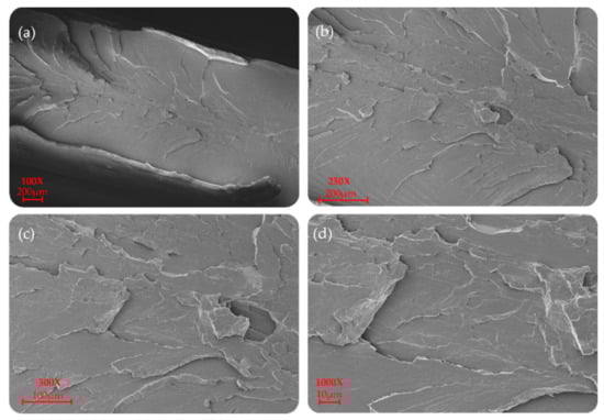 SEM morphology of the surfaces of the P(L/DL)LA/PLCL blend: (a–d) images correspond to specimens manufactured by IM at different magnifications.