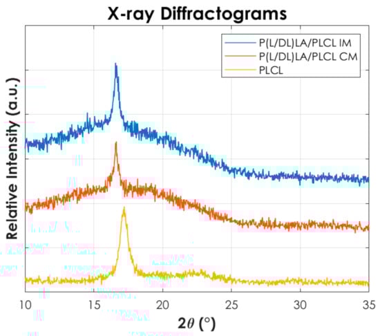 Figure 8 shows the X-ray diffraction pattern of the PLCL and the samples of the blend P(L/DL)LA/PLCL obtained by CM and IM. P(L/DL)LA is not reported since it has an amorphous structure.