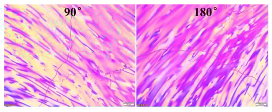 Mesophase pitch with a softening point (SP) of 280 °C was prepared from fluidized catalytic cracking decant oils (FCC-DO) via two-stage reactions. The FCC-DO was first distilled at 300 °C under vacuum to remove the light components; subsequently, the vacuum residue was thermal condensed at 400 °C for 5 h under nitrogen atmosphere to obtain the spinnable mesophase pitch. As shown in Figure 1, the FCC-DO-derived mesophase pitch showed optically anisotropic features with the mesophase content reaching 100 vol.%, whereas its toluene-insoluble (TI) and quinoline-insoluble (QI) contents were measured as 70% and 51%, respectively. The pitch fibers (PFs) were prepared from the FCC-DO-derived mesophase pitch on a melt spinning apparatus equipped with a 500-hole spinneret with L/D = 0.4 mm/0.2 mm at a spinning temperature of 320 °C and nitrogen pressure of 0.5 MPa.