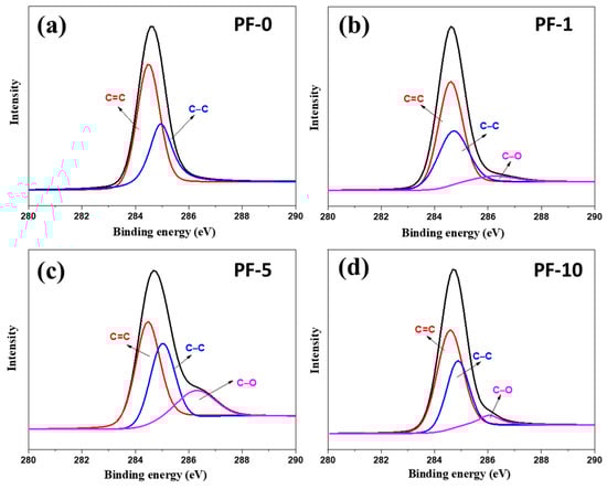 Figure 2 shows the C 1s XPS spectra of PFs with different PIM times. The C 1s peaks of PF-0 were decomposed into two peak signals at about 284.6 and 284.9 eV, as shown in Figure 2a, which were attributed to the graphitic C=C and aliphatic C–C bonds, respectively. During the PIM treatment, the oxygen free radicals attacked the aromatic rings and aliphatic groups of pitch to form oxygen functional groups on the surface of PIM-derived PFs. In comparison to pristine PFs, PIM treatment led to the appearance of a new peak signal at about 286.3 eV, which was related to the formation of C–O functional groups in PIM-derived PFs (Figure 2b–d) [22]. Table 1 summarizes the XPS results of different PIM-derived PFs using the calculation method based on the peak fitting area. It can be observed that PF-5 showed the highest oxygen content (15.4% for PF-5) compared to PF-1 and PF-10 (4.8% for PF-1 and 7.0% for PF-10). This indicates that excessive PIM treatment had a force great enough to break the chemical bonds and damage the fiber surface.