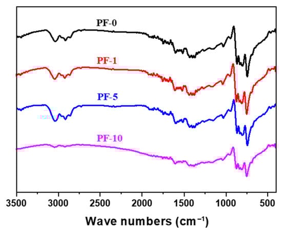 The FT-IR spectra of PIM-derived PFs are shown in Figure 3. It can be observed that PF-10 exhibited some very weak peaks at around 2960 and 3050 cm−1, indicating that some methyl C–H bonds and methylene C–H bonds inside aliphatic chains were broken under excessive PIM treatment. Furthermore, PF-10 showed some weak peaks at around 3100, 1260 and 1700 cm−1 compared to the other fibers, corresponding to –OH, C–O–C or O–C–O stretching, and carbonyl C=O stretching, respectively. This confirmed that long-term PIM treatment can result in excessive decomposition of PFs due to the plasma with high energy breaking the chemical bonds and damaging the fiber surface, which is consistent with the above XPS results.