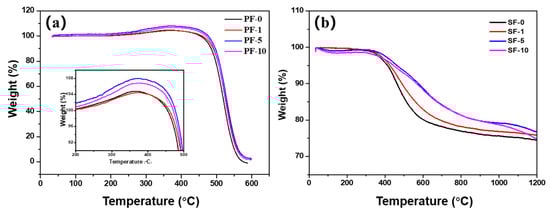 Moreover, the elemental analysis and C/O ratio of different PIM-derived PFs and SFs are summarized in Table 2. It can be observed that PF-0 contained 0.78 wt.% oxygen with a C/O ratio of 161.6. The oxygen content and C/O ratio of PF-5 were found to be 2.95 wt.% and 41.6, strongly indicating that the appropriate PIM treatment is conducive to the introduction of oxygen. In addition, PIM-derived SFs behaved similarly to the elemental analysis results of PIM-derived PFs. SF-5 had the highest oxygen content of 12.52 wt.% and lowest C/O ratio of 8.9, which also indicates that PF-5 had a great oxidative property in forming a stable crosslinked structure in SF-5, promoting the resultant stabilization process.