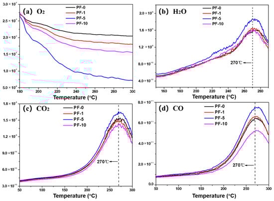 The mass spectroscopy (MS) curves of PFs systematically revealed the evolution of O2, H2O, CO, and CO2 during the stabilization process, as shown in Figure 5. It should be noted that the primary m/z number of CO is identical to N2. Therefore, the m/z number of 12 as a cracking number was analyzed in multiple ion detection (MID) mode to detect the produced CO, and the intensity of the cracking number (m/z = 12) was only 5% of the intensity of the primary number (m/z = 28) [23]. In the early stage of stabilization, a certain number of ketone functional groups were introduced through oxidation and dehydrogenation, which was accompanied by the formation of H2O. In the later stage of stabilization, carbonyl oxygen bridge structures were formed via the insertion of oxygen. Subsequently, carbon monoxide and carbon dioxide were released through the intermolecular and intramolecular crosslinking reactions of pitch [6,24,25]. The weight uptake of PFs began at 180 °C, and PF-5 consumed the most O2 compared with other PFs. The H2O started being produced above 160 °C, and the maximum value was seen at about 270 °C. Likewise, it can be observed that the amount of H2O released from PF-5 was rather high compared with other PFs. The released CO and CO2 were derived from crosslinking reactions of pitch molecules in the late stage of stabilization, and the maximal peak values of both CO and CO2 were observed at about 270 °C. It is evident that the evolution trend of PF-1 was similar to that of PF-0. Moreover, the release amounts of CO and CO2 from PF-5 were the highest compared with other PFs. These results indicate that PIM treatment of 5 min could promote oxidation reactions during the stabilization process and form more carbonyl oxygen bridged structures. Furthermore, PF-10 released a minimal amount of CO2 and CO, which proves that long-term PIM treatment resulted in a decrease in the number of methyl carbons (–CH3) and methylene carbons (–CH2–) inside aliphatic chains of PFs. All results show that insufficient and excessive PIM treatment is not conducive to the introduction of oxygen functional groups in PFs.