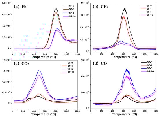 Figure 6 shows the evolution of H2, CH4, CO2, and CO of SFs during their carbonization process. The H2 was released in the range of 600–1000 °C, and the maximum value was at about 800 °C. The evolution of CH4 began at 400 °C, and the maximal peak value was observed at about 600 °C, which represented the decomposition of aliphatic compounds of SFs [26]. It can be observed that the amounts of H2 and CH4 released from SF-0 and SF-1 were rather higher compared with SF-5 and SF-10. This is because the SFs obtained under short-term PIM treatment struggled to form stable crosslinked structures in the core of fibers, resulting in more H being removed at the early stage of the carbonization process due to deoxygenation [27]. CO2 and CO were derived from carboxyl groups and acid anhydrides obtained by oxidation, the maximal peak values of which were observed at about 500 °C and 650 °C, respectively. It is evident that the release amounts of CO2 and CO from SF-0 and SF-1 were far lower than from SF-5 or SF-10. Moreover, there is no doubt that the release amounts of CO2 and CO from SF-5 were the highest compared with other SFs due to the increase in oxygen-containing functional groups of SF-5.