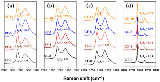 Figure 7 shows the Raman spectra of different PIM-derived PFs, SFs, CFs, and GFs. The Raman D-band at around 1360 cm−1 and G-band at around 1580 cm−1 correspond to the defect lattice vibration mode and ideal graphite lattice vibration mode, respectively [28]. Therefore, the intensity ratio of the D-band and G-band (ID/IG) allows evaluating the carbon crystallite character, and a lower value of ID/IG indicates fewer defect sites and more highly ordered orientation in fibers [29]. It is evident that the ID/IG ratios of both PF-5 and SF-5 were much higher than those of other PFs and SFs (ID/IG = 0.89 for PF-5, ID/IG = 0.94 for SF-5), related to their oxygen crosslinked structure with the highest oxygen content, as shown in Table 2. However, the ID/IG ratios of both CF-5 and GF-5 (ID/IG = 1.09 for CF-5, ID/IG = 0.09 for GF-5) were much lower than those of other CFs and GFs, related to fewer defect structures and their highly ordered carbon crystallite orientation, in accordance with their higher mechanical properties and thermal conductivity.