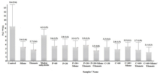 The water absorption for 24 h (WA24h) of composites (Values represent means of 10 replicates/test. Values in parentheses represent one standard deviation; the detail for samples’ name shown in Table 1).