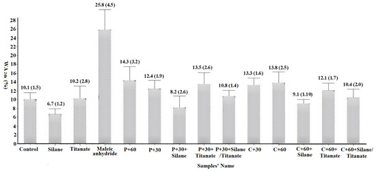 Water uptake and thickness swell were determined by weighing each 50 by 10 mm sample then measuring its dimensions. The samples were immersed in water at room temperature (20 °C) for 24 h. The samples were weighed and dimensions were measured after 24 h of immersion. Differences between initial and final measurements were used to calculate water absorption and thickness swelling (Figure 2 and Figure 3), respectively [27].