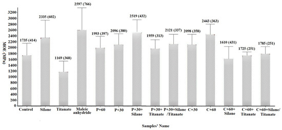 Pectinase pretreatment for 30 min or cellulase pretreatment for 60 min also improved the mechanical properties of the composites and were selected to study potential synergistic effects between enzyme pretreatment and coupling agent (Figure 4 and Figure 5). Adding only one coupling agent did not markedly decrease thickness swell compared to the enzymatically pretreated fibers alone. However, TS24h decreased by 75.0% for panels composed of cellulase pretreated fibers with 2.5% Silane/titanate. The greatest reductions in swelling were associated with both coupling agents and cellulase pretreatment, but the differences between pectinase and cellulase pretreatments were small. The effects of both enzymatic pretreatment and addition of coupling agents on properties are in line with the previous research [14,19,23]. The combination of these elements creates opportunities to further increase fiber/plastic compatibility to enhance panel properties. Coupling agents can improve compatibility between fiber surfaces and the plastic, improving water resistance, while enzymatic pretreatment can modify chemical groups on the fiber surface [23].