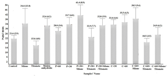 The Modulus of rupture (MOR) of composites (Values represent means of 10 replicates/test. Values in parentheses represent one standard deviation; the detail for samples’ name shown in Table 1).