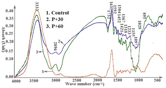 Peaks at 3332 cm−1 (O–H stretching of bonded hydroxyl groups) and 895 cm−1 (C–H deformation in cellulose) were higher on spectra from samples treated for 30 min with cellulase than those on samples treated for 60 min; but peaks at 1592 cm−1, 1504 cm−1, 1452 cm−1, 1421 cm−1, 1367 cm−1, 1318 cm−1, 1233 cm−1, 1155 cm−1, 1097 cm−1, and 1029 cm−1 (lignin, hemicelluloses) were higher on spectra from samples treated for 60 min. The results suggest that cellulase pretreatment exposed more cell wall polymers [35], which could enhance subsequent plastic interactions.