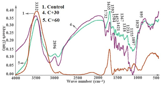Enzyme pretreatment produced some differential effects depending on exposure time. Peaks at 3332 cm−1 (O–H stretching of bonded hydroxyl groups), 1029 cm−1 (C=O stretching vibration in cellulose, hemicelluloses and lignin), and 895 cm−1 (C–H deformation in cellulose) were all higher on samples treated with pectinase for 60 min compared to those treated for 30 min. Peaks at 1592 cm−1, 1504 cm−1, 1452 cm−1, 1421 cm−1, 1367 cm−1, 1318 cm−1, 233 cm−1, 1155 cm−1, and 1097 cm−1 corresponding to lignin and hemicelluloses were higher on samples treated for 30 min with pectinase than those treated for 60 min. The results suggest that pectinase exposed more cell wall material on the fiber surface, potentially improving interactions, especially with the more hydrophobic lignin component. Increased pretreatment time was also associated with increases in peaks at 1029 cm−1 and 895 cm−1 corresponding to C=O stretching of all three cell wall polymers and C–H deformation of cellulose, respectively [29,30,31,32]. These results support earlier results [35].