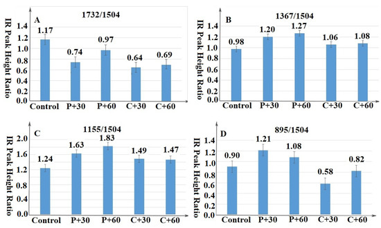 Delineating differences in peaks in a given spectrum can be difficult. One way to study differences is to choose relatively stable peaks across treatments and then compare peak height ratios. Peaks at 895, 1155, 1367, 1504, and 1732 cm−1 representing C–H deformation in cellulose, C–O–C vibration and C–H deformation in cellulose and hemicelluloses, C=C stretching in lignin, and C=O stretching in xylans, respectively, were chosen for comparison (Figure 8).