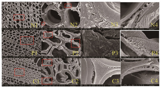 Scanning electron micrographs of cross sections cut from hemp hurd samples with no treatment (N1, N2, N3, and N4), exposed to pectinase for 30 (P1, P2, P3, and P4), or cellulase for 60 min (C1, C2, C3, and C4) and increasingly higher magnifications of the same fields.