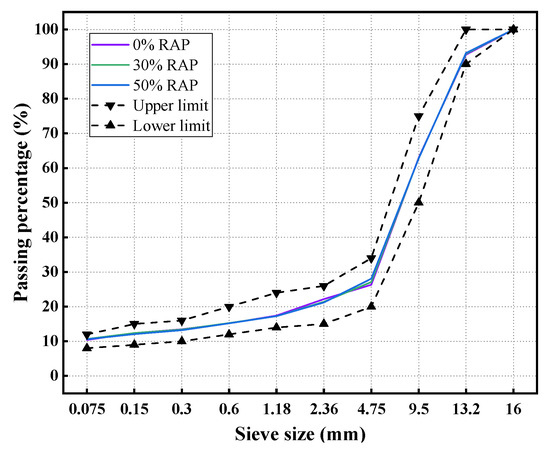 With standard SMA-13 gradation, the reclaimed asphalt mixtures were designed for workability and performance tests. The RAP content in the reclaimed mixtures was 0% (virgin asphalt mixtures), 30% and 50%, respectively. As depicted in Figure 3, the combined gradations of those asphalt mixtures were designed as close as possible to eliminate the interference of gradation. Based on Marshall mix design, the asphalt contents were determined as 6.0% for these reclaimed mixtures (see Table 4).