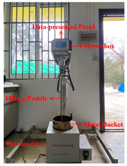 It is confirmed in many previous studies that the torque generated when stirring asphalt mixtures is highly related to the mixing workability of mixtures [26,27,28]. The lower mixing torque means the better workability of asphalt mixtures. In this study, the mixing torque was used to characterize the workability of reclaimed asphalt mixtures. A device that can measure the torque was self-fabricated and used. Figure 4 shows a photograph of this device, which mainly consists of (1) motor box (ANGNI, AN1000, Shanghai, China), (2) mixing paddle, (3) metal bucket, and (4) thermostat. The motor allows the device to stir at different speeds. Importantly, the device includes a data-acquisition system that enables it to record the torque readings automatically.