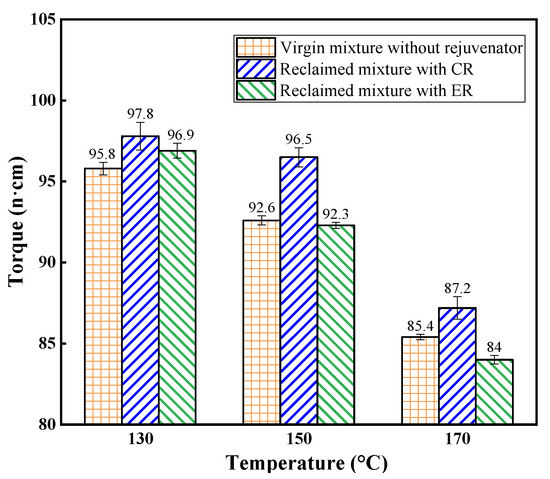 By comparing the torque values obtained from the reclaimed asphalt mixtures, it can be seen that reclaimed mixtures with ER showed lower torque values than that with CR, indicating that ER helped to improve the workability of reclaimed mixtures. This can be due to that compared to oil mediums, the oil-water emulsified film showed better lubricating effect during the mixing process [31]. The resistance between aggregates particles, thus, was reduced. Furthermore, the greater difference in torque values for the reclaimed mixtures at higher temperature (150 °C and 170 °C) can be obtained. The torque values for reclaimed mixtures with ER were even lower compared to virgin mixtures.